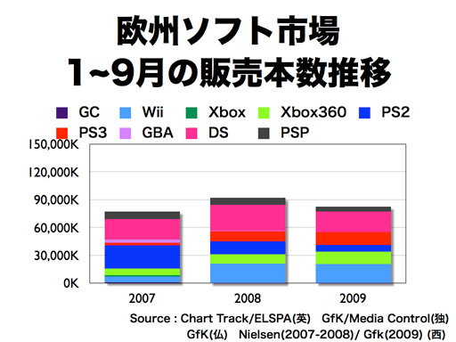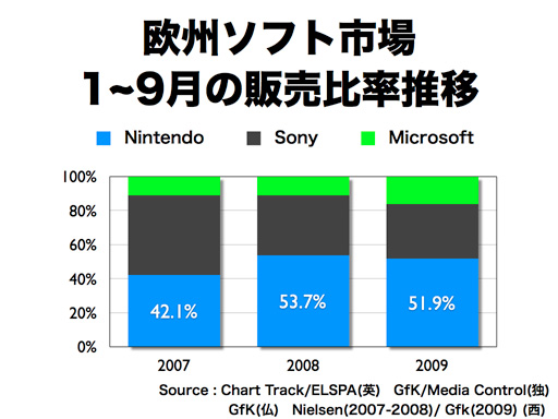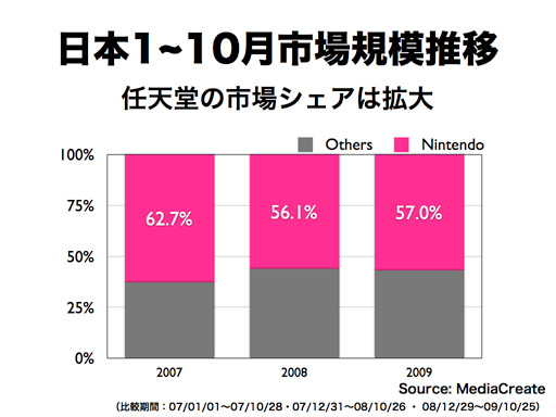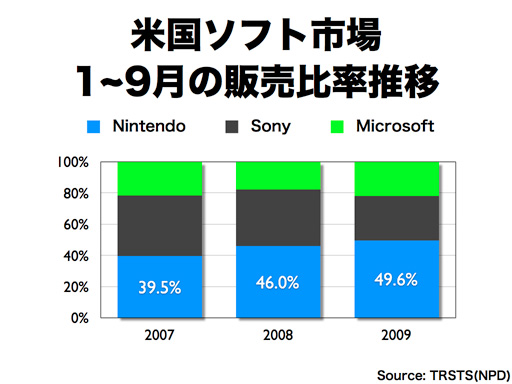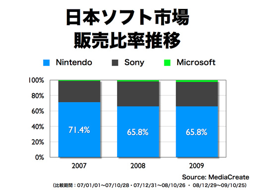 ソフト全体を3社のハードメーカー別のシェアの推移で見ますと、意外に思われるかも知れませんが、Wii・DSのソフト販売数が微増したのに対し、市場全体が縮小していますので、任天堂プラットフォームのシェアは若干高まっています。