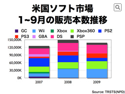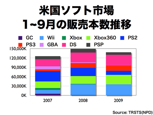 ソフト全体を3社のハードメーカー別のシェアの推移で見ますと、任天堂プラットフォームのシェアは、Wiiの本数減とDSの本数増に市場全体の縮小が相互に打ち消しあって、ちょうど前年と同じシェアになりました。