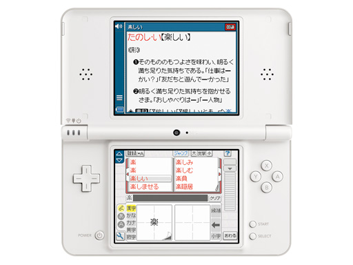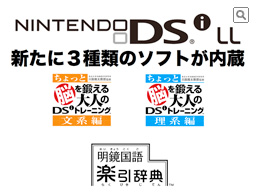 DSi LLには、DSiウェアとして既に発売されている「ちょっと脳を鍛える大人のDSiトレーニング」のソフト、文系編・理系編の2種類や、手書きで読めない漢字を書くと認識してくれる明鏡国語楽引辞典が内蔵されているなど、新しい機能も搭載しています。