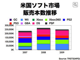 2009年のアメリカのソフト市場全体は、前年割れとなっています。DS、Wiiとも前年を若干ですが上回っていますが、全体としては、ソニーさんのPS2、PSPのソフト販売の減少を補うことはできませんでした。
