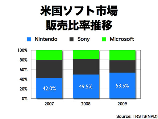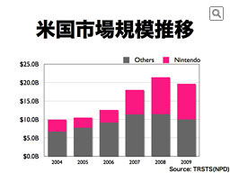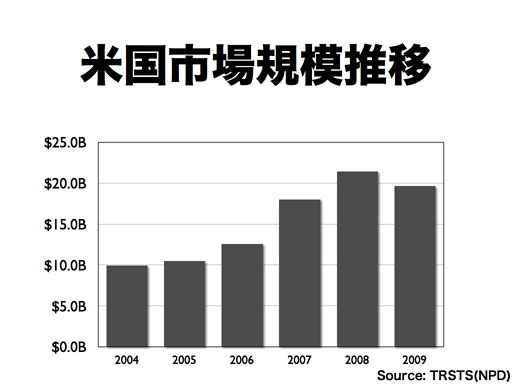 2004年から比較すると4年で2倍以上に急成長したアメリカ市場ですが、2009年は、ハード販売台数・ソフト販売本数の減少と、ハードの値下げによる販売単価の減少などが原因で、NPDの発表で既に報じられているように、前年対比でマイナスとなってしまいました。