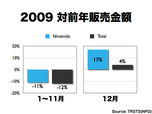 左側のグラフは、2009年11月までの対前年の販売金額の比率です。業界全体が12%のマイナスであったのに対し、任天堂プラットフォームも11%のマイナスとなっていました。ただし、先ほどご説明したように12月はDSとWiiが大きく販売を伸ばし、昨年以上の結果となりましたので、12月は、ご覧のように対前年比がプラスとなり、通年でも、任天堂プラットフォームの対前年比は3%マイナスにまで回復し、業界全体が8%のマイナスと、マイナス幅は若干縮小しました。
