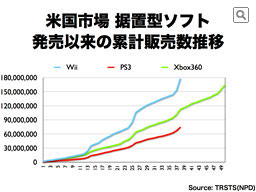 また、12月には、もうひとつ、現行の据置型ハードにおいて、Wii累計のソフト販売数が1億7,804万本となり、1年先行していたマイクロソフトさんのXbox360の累計ソフト販売数1億6,470万本を追い越し、現行の3つのプラットフォームの中で、Wiiが最もソフトが売れたプラットフォームになりました。