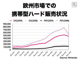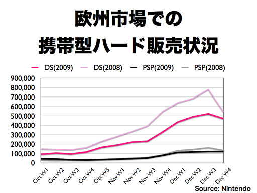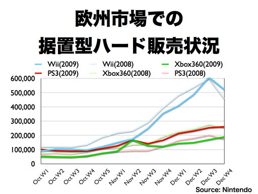 一方、ヨーロッパのDSハードは、2007年、2008年と年末に爆発的に売れてきましたが、2009年は、盛り上がりが小さく終わってしまいました。ただし、それは単純に他機種に市場を奪われたからではないことも明らかです。2009年年末に大ヒットタイトルのなかったDSは、年末ヒットソフトに恵まれたWiiと比較すると、お客様に注目していただけなかったのではないかと感じています。