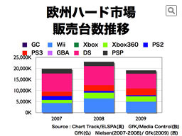 ヨーロッパのハードの販売台数は2008年には大きく伸びたのですが、2009年は2007年とほぼ同水準にまで戻ってしまいました。アメリカと異なり、DSやWiiも、他の多くのプラットフォームと同じように販売台数が前年を割り込んでしまいました。