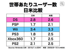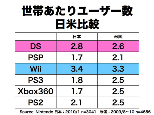 これは、その最新のデータですが、DSやWiiは、世帯あたりユーザー数が明らかに他のプラットフォームより多い、すなわち、家庭の中でより多くの方に触っていただけているゲーム機であることはデータでも示されています。