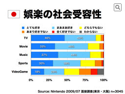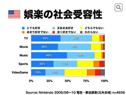 アメリカでも全く同じことを調べているのですが、日本と傾向は大きく変わりません。アメリカは、日本以上にゲーム人口比率が高く、ビデオゲームにとってもっとも恵まれた世界最大の市場ですが、それでも、ビデオゲームの社会受容性は、日本と同じく、他の主要な娯楽に遠く及んでいないのです。