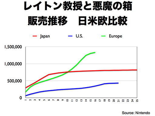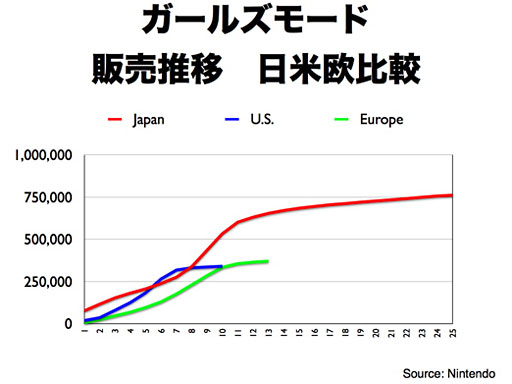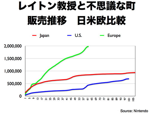 岩田: まず、「社長が訊く」をもっと宣伝すべきだと、いうお話については、「自分で宣伝するのはいかがなものか」という気もいたしますので、皆さまにご協力いただければと思います。 それから課題ですね。おっしゃるとおり、DSのヨーロッパのソフトを含む、「その他地域のDSソフト」が、(先ほどのプレゼンでもお話ししたように)任天堂の出荷ベースの減少よりは実売ベースの減少というのは少ないですけれども、実売ベースでも2割くらい減っているわけですから、これは由々しき事態だと思っています。一部には、「これはマジコン等による海賊行為が原因ではないか」と言われていたりもするんですが、それだけですべてが説明できるとは思いません。DSが普及し、ソフトがよく売れていく過程では、社会の話題にしていただけるような出来事が起きていたと思うんです。それは、日本でも『脳トレ』がそうでしたが、ヨーロッパでも『ニンテンドッグス』や『脳トレ』というのはそういう状態でした。昨年も『脳トレ』はそれなりにヨーロッパで売れていまして、まだ百数十万本売れているんですが、その前の年に何本売れたかと調べますと、300万本以上売れていたりします。すると、社会の話題として『脳トレ』は以前ほど目立たなくなります。また、社会の話題として『ニンテンドッグス』は以前ほど目立たなくなっています。その代わりのものを任天堂が提案できていて、社会の話題である状況を維持できていれば、その結果、DSプラットフォームの活性が高まり、活性が高まればいろんなソフトが裾野で売れていくと、いうことが起こりやすくなるわけですが、そういう流れにできていないということなんです。ですから、われわれにとって最も重要なのは、社会の話題になるようなDSソフトを作り出すことではないかと思います。 『レイトン教授と不思議な町』(株式会社レベルファイブが開発し海外では任天堂が発売)はヨーロッパで状況が良くて、これは2週間前までの(販売推移の)グラフですが、先週現地から「(累計販売数が)200万本になりました」という報告が来ていましたから、こういう例も出ているんです。この200万本という数字は確かに素晴らしいんですが、「社会の話題になっているのか」というと、『ニンテンドッグス』やあるいは『脳トレ』の売れた本数に比べると、やはりまだ小さいんです。また、このソフトで遊びたいからハードごと買ってくださるとか、このソフトによって稼動していなかったDSが大量に稼動するようになり、社会の話題になって新聞等で扱っていただく、というところまでは到達していません。『レイトン』は2作目(『レイトン教授と悪魔の箱』)もよく売れていまして、これまでの累計でヨーロッパで130万本強ぐらいですかね、順調にいけばまだまだ伸びる推移だと思います。このほかに、『リズム天国』というソフトを昨年アメリカやヨーロッパで売れないかということで試みたんですが、これは残念ながら良い結果が出せませんでした。 もう1つ、昨年、『ガールズモード』というソフトを売ったんですね。これはまだ、「よく売れました」とは言い難い段階なのですが、大体売れている量ってこれくらいなんですね。まだ、(累計販売本数も)日本には及びませんが、一方で、出足をご覧いただくと、(日本と比べて)ものすごく悪いんですね。普通はこんなに出足の悪いソフトはまず売れないです。実は、ヨーロッパの最初の報告で初週の売れた量が5,000本だというのを聞いた時、目の前が真っ暗になるくらいショックだったんです。逆に言うと、初週5,000本だったソフトをここまで持ってこられたというのは、「現地の人たちは、(このソフトの拡販に向けて)本当に頑張った」と思います。販売推移が、今は伸び悩んでいるようにも見えるかもしれませんが、実はこれは品薄によるものなんです。すなわち、最初はあまり出足が良くなかったので、(小売店さんからのリピート)注文をあまりいただけなかったんですが、年末にガガガガっと売れて品切れになってしまったということが起きています。実際に、『ガールズモード』を遊んだ海外のお客様たちからは、「これはすごく熱中できて面白い」というようなことを言っていただけています。海外のDSマーケットは、女の子向けの一見よく似たタイトルが山ほど出ましたので、そのおかげで女の子タイトルと言うだけで小売店さんは「もう期待できない」というような食わず嫌い的な部分もあったり、お客様にもその価値を伝えるハードルがあったりしたんですが、ここまで来ますと、(『ガールズモード』の)価値を広めてくださるお客様の基盤ができましたので、今後の取り組み次第でもう一段高みに持っていけるかもしれないと思っています。ただ、こういうことだけではなくてもっと、世の中で本格的に話題になることを生み出せるかどうかということが、非常に重要なのかなと思っています。もちろん、ヨーロッパに