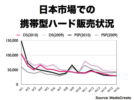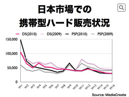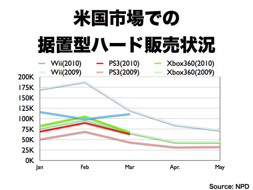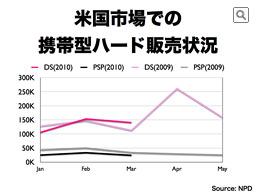 これは、同じくNPDグループのデータを元にした、携帯型ハードの販売推移です。2月、3月と、これまでのNPDの実績で、それぞれ2月単月・3月単月の月間販売数の新記録を作るなど、DSの今年の出足は決して悪くありません。ただし、昨年は4月に新製品のニンテンドーDSiを発売しており、そこで大きな盛り上がりがありましたので、4月は昨年を下回ることが予想されます。