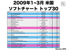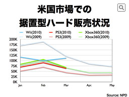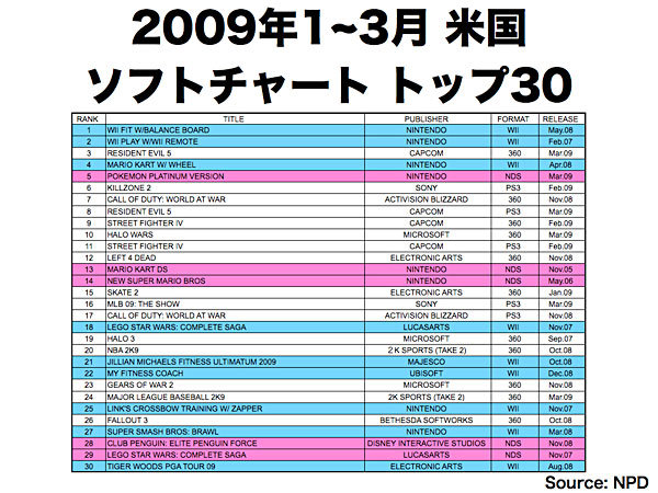 一方、この時点ではWii本体のビジネスは好調とまだ見られていた時期ですが、その前年末に発売したソフト、例えば、『Animal Crossing(どうぶつの森)』 や『Wii Music』は、既にランキング外になっていました。その前年の春に発売した『Wii Fit』や『Mario Kart』、あるいはアメリカでは2007年2月に発売しているWiiの定番ソフトである『Wii Play(日本での名称は『はじめてのWii』)』が市場を支えているという、やや不健全な状態でした。そして、年明け以降Wii向けの有力ソフトが7月の『Wii Sports Resort』までありませんでしたから、このことが、春以降にWiiが勢いを失っていく流れを作ってしまったと考えられます。