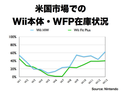 昨年12月のWiiハードの販売数は、NPDのデータ集計で歴代の記録を大幅に塗り替えるものだったことは1月にもお話ししましたが、このことにより、年明け以降、生産してから輸送に時間がかかるWii本体やバランスボード同梱の『Wii Fit Plus』は、深刻な在庫不足に陥る結果となってしまいました。在庫不足が特に深刻だったのは、1月後半から2月にかけてです。特にバランスボード同梱の『Wii Fit Plus』については、ほぼ3週間は、まったく店頭で見つからないという事態を招いてしまいました。