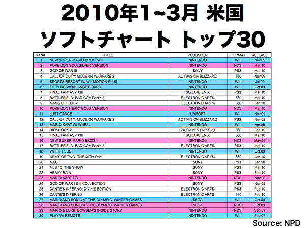 これは、NPDによる昨年1〜3月の累計ソフト販売数ランキングのトップ30です。