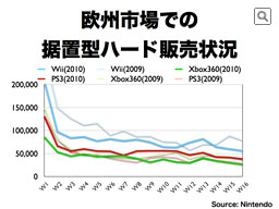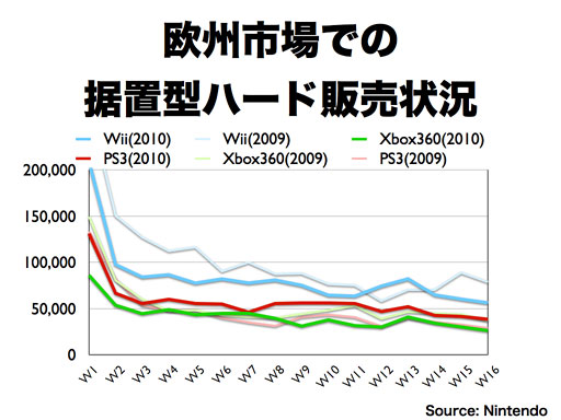 アメリカでは、今年に入ってもXbox360がPS3をリードしているのですが、ヨーロッパでは、2009年秋以降にPS3が伸びて、Xbox360が落ち込んでおり、パブリッシャーさんがマルチプラットフォームで展開した大作ソフトの恩恵というのは、主にPS3への追い風となっているようです。
