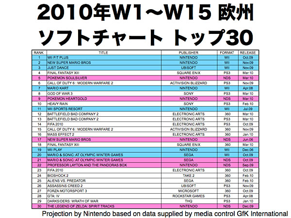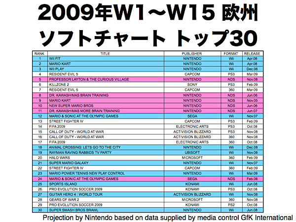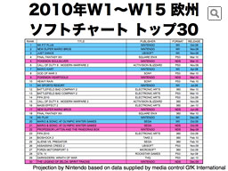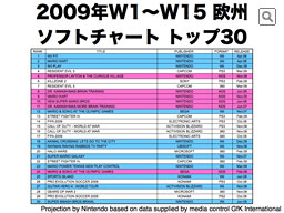 これは、昨年の第1週から第15週までのソフトの販売数を、GfKさんの7ヶ国分のデータ、具体的には、イギリス、フランス、ドイツ、イタリア、スペイン、オランダ、ベルギーのソフトの販売データを任天堂で集計してまとめた、ソフトのヒットチャートのトップ30です。