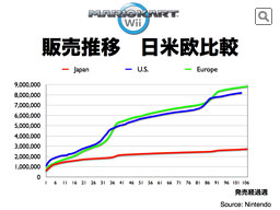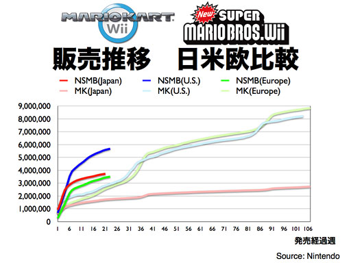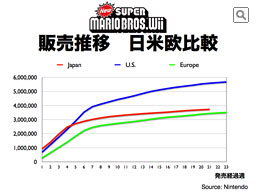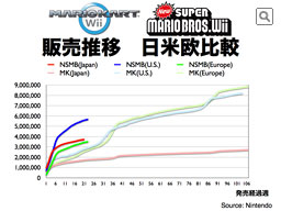 ちなみに、この『マリオカートWii』の販売推移に『New スーパーマリオブラザーズ Wii』の販売推移を重ねてみると、このようになります。販売の勢いなどを見ても、日本とアメリカでは『マリオカートWii』以上のポテンシャルがあり、ヨーロッパについても、『マリオカートWii』に匹敵するような可能性があることをご理解いただけるのではないかと思います。