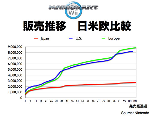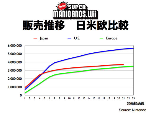 一方、Wiiの普及台数が、日本よりもヨーロッパの方がはるかに大きいこと、そのほかマリオが登場するソフトの販売実績がヨーロッパの方が大きいことから考えて、ヨーロッパでも大きなポテンシャルがあることには違いがありません。むしろこれからが楽しみと言えると思います。
