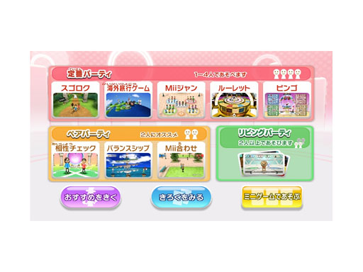 このソフトも、じっくり時間をかけて開発していることもあり、パーティゲームとして安心感、安定感のある内容になりましたし、ボリュームも盛りだくさんで、Wiiを楽しまれているどんなお客様にも楽しんでいただけるように仕上がったと思います。また、右下の「リビングパーティ」のモードでは、Wiiリモコンだからこそ可能になる新機軸の遊びも盛り込んでいます。