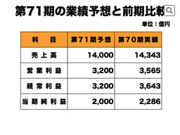 これに基づきまして、第71期の業績予想は、売上高1兆4,000億円、営業利益は3,200億円を見込んでおります。経常利益は、期末における想定為替レートを1ドル95円、1ユーロ120円という前提において、経常利益の予想として3,200億円、当期純利益は2,000億円を見込んでいます。