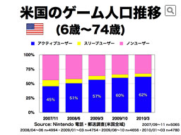 このようになります。アメリカにおけるゲーム人口拡大は、WiiとDSがその主役となって牽引しているということがよくおわかりいただけると思いますし、今でもゲームを新しく始められるお客様が新たにゲームの世界に入ってこられているということ、そして日本と違い、ゲームをやめてしまうお客様の割合が非常に小さいということがわかります。
