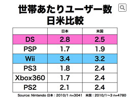 また、私たちが中期的に重視する指標としてお話しした、世帯あたりユーザー数ですが、全体として、他社さんのプラットフォームについて世帯あたりユーザー数が下がる傾向が出ていますが、WiiとDSは、日本・アメリカ共に最新の調査でも高い水準を保っています。