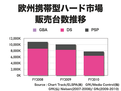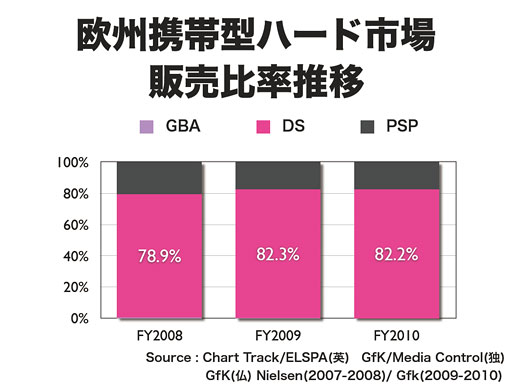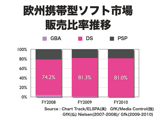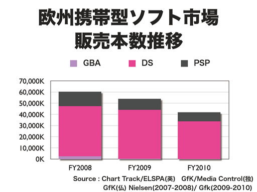 岩田: これは決算短信にも出ている資料ですが、DSのハードについてのものです。これは任天堂グループから外へ出ていった、任天堂が販売したもので、流通さんに在庫になっているものも含んだセルインの台数です。出荷台数と言ってもいいかもしれません。日本は前期とほとんど同じ水準です。アメリカは史上最高になりました。これに対して、その他地域は非常に落ち込みが大きく28%減っています。これはセルインのデータなので、セルスルーはどうなのかということを調べました。これです。ヨーロッパの主要4カ国分のデータで、販売台数の推移を年度で3年間比較したものですが、一番右が70期(FY2010)ですね。68、69期(FY2008、FY2009)はほぼ同水準できたけれども、70期(FY2010)でガクンと下がりました。23%ぐらい下がっています。ただ、任天堂の携帯型ゲーム機のハードのシェアが落ちているわけではありません。市場全体が小さくなっているということです。これに関しては、多分に、ヒットタイトルが携帯型に少なくて、据置型に多かったということで、据置型の比率が高まったという要素がかなりありそうだという気がいたします。 ただ、それよりも、誰が見ても不健全に見えるのがソフトです。ソフトは、日本はほぼ横ばいできております。アメリカが10%ぐらい減っています。しかし、その他地域では43%減っています。これは1年の減り方としてはやはり極めて大きい、大き過ぎる数値です。一部報道等では、「これはR4の影響なんだ」と、「R4のような海賊コピー装置による海賊行為の影響でソフトのマーケットがおかしくなったんだ」という説明がなされていたりしますが、その影響は確かに存在します。ヨーロッパはアジア地域の次に今、海賊行為の問題が深刻になっていると思っていますが、一方で、それだけでこのマーケットの変化を説明するのは、いかにも乱暴です。セルスルーの方も調べてみました。これがそうです。4カ国で見ますと、DSソフトの販売数の減少幅というのは23%ぐらいです。では何が起こったのかというと、このFY2009、真ん中のところです。この年の秋にリーマンショックが起きて、世界同時金融危機、世界同時不況になりました。そして、そこまではソフトメーカーさんも小売店さんも、DSのビジネスの拡大を見ながらビジネスチャンスととらえられて、非常に強気の発注をしておられたのですが、この時点を境に、一気に姿勢が変わりました。変わったのは2009年の年明けぐらいからだと記憶しています。そうすると、まず新規の注文が極端に減ってまいります。現実に、68期(FY2008)と69期(FY2009)に出荷していたソフトの中には、やはり、お客様の手に渡らずに、小売店さんで在庫になっていたものがあるように思います。それらを処分するのが先ということで新規の仕入れを極端に控えられるということの影響も、この第70期(FY2010)はずいぶん強く受けたと思います。ちなみに、年が明けてから何回リピートオーダーがあったかについては、あまり回数は変わっていません。小口のリピートはいっぱい来ているそうです。すなわち、売れるとちょっとずつ注文はしてもらえるわけです。ところが、リスクを追ってドカンと勝負ということを、流通さんがされなくなりました。流通さんがされないので、ソフトメーカーさんもされないということになり、その結果、ソフトメーカーさんのソフト(出荷数)が大きく減ってしまったということです。ただ、43%というのは出荷での減少で、セルスルーベースの影響というのは2割強であるということなので、そのペースで本当に市場が縮小しているわけではないと言えます。 もちろんこれは、放置できる状況では到底ございませんので、日本で再活性化ができたように、ヨーロッパでの再活性化をいかにするか、どのソフトでするか、特に、携帯型ゲーム機のヨーロッパのビジネスパターンでは、夏商戦の結果がかなり年間のビジネスの結果を左右すると感じておりますので、この夏商戦に向けていろいろな準備をしているところです。ちなみに、販売比率で見ますとやはり(DSソフトの販売シェアは前年と)ほぼ変わっていませんので、携帯型ソフトに関しては、DSだけの問題ではないということが言えます。ただ、これほど急激に市場が変わっているのはヨーロッパだけの現象ですので、ヨーロッパのこの現象について、より的確な手を打って、良い手ごたえを次回以降にご報告できるように努力したいと思います。 |