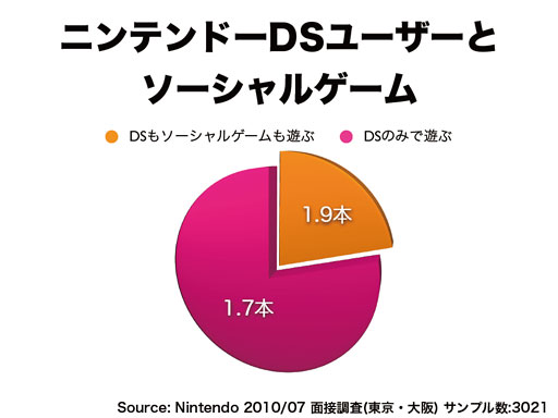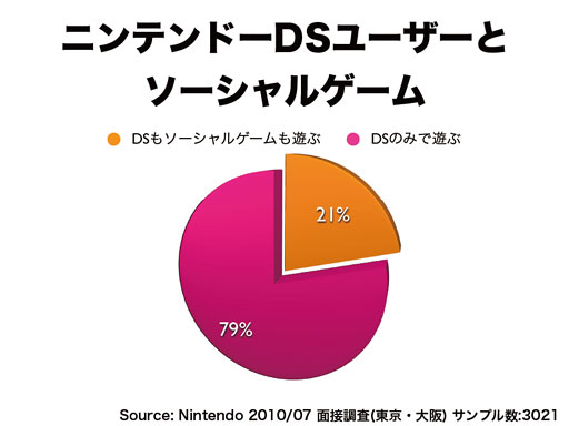 「ソーシャルゲームが流行したから任天堂の業績が悪くなった」というような話が報道されることがあります。時期的に任天堂がWiiやDSで業容を拡大した後、少し踊り場が来てちょっと下がったという今の状況と、日本で携帯電話用のソーシャルゲームが急拡大した時期というのが一致するものですから、「これには因果関係があるのではないか」、すなわち「DSやWiiのお客様が大量にシフトしているのではないか」、「今までゲームにお金を払って遊んでいたけれども、ゲームが無料で遊べるようになったので、それが原因だ」ということがよく新聞に書かれたりしておりますので、本当にそうなら私たちは何かしないといけませんし、そうでないなら、「そうではありません」とはっきり申し上げた方がいいと思い、ちょっと調べました。 |
