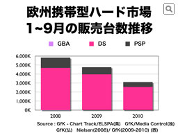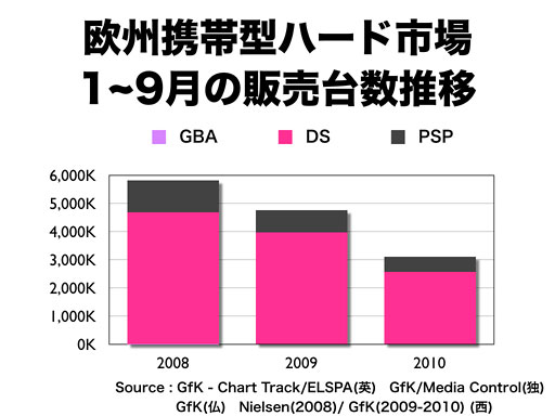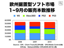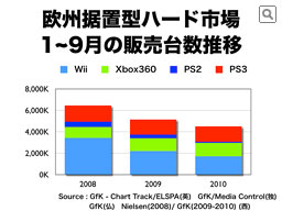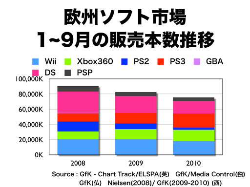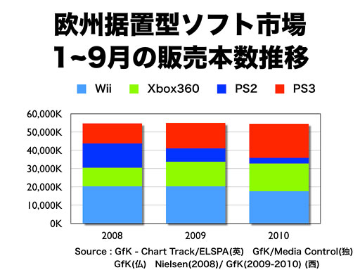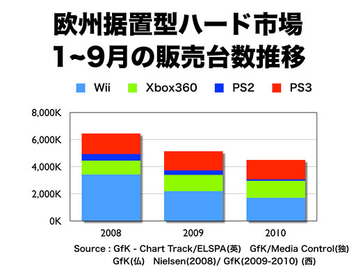 これは、2008年から2010年までの1〜9月の据置型ハードの販売台数を、イギリス、フランス、ドイツ、スペインの4カ国の各国の調査会社さんが発行しているデータを任天堂で集計して比較したものです。ヨーロッパ全体の市場のうち、この4カ国の市場規模は、約75%から80%程度になりますので、これら4カ国の集計結果でヨーロッパ市場の傾向をお話ししていきます。