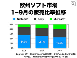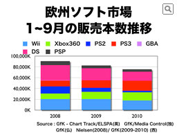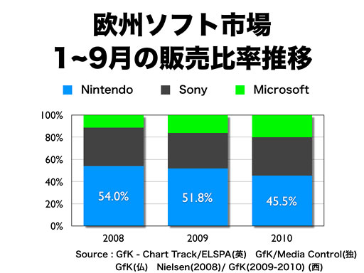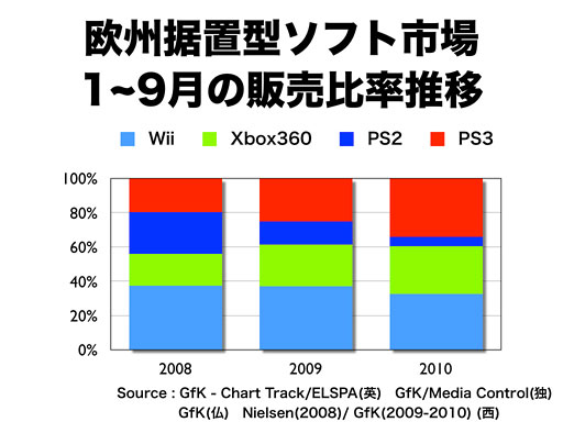 ヨーロッパでは、アメリカのようにXbox360が顕著に伸びているということは起こっていません。販売数での対前年比では、Wiiがマイナス、Xbox360、PS3は共にプラスですが、一方でWiiが最も売れているトップシェアの据置型ハードであるということは変わっておりません。