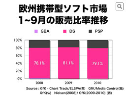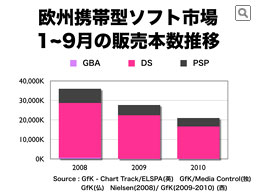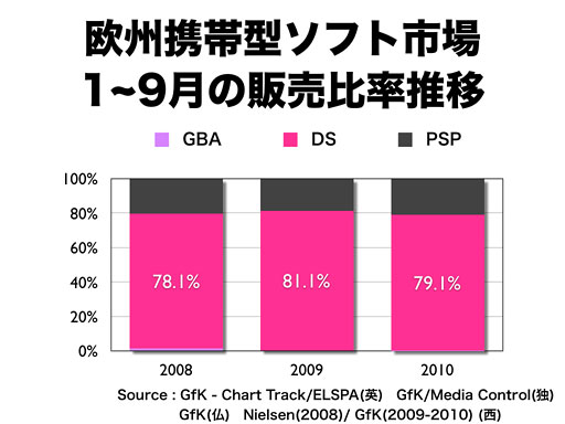 一方、これは、ヨーロッパ市場におけるソフトの販売本数の推移を比較したものですが、ヨーロッパは、携帯型ソフト市場が一度急拡大し、アメリカに匹敵する規模に近づきましたが、据置型ソフトがこの2年、市場規模を維持しているのに対して、携帯型ソフト市場は、市場規模を維持できていません。