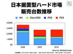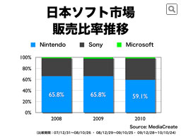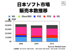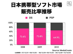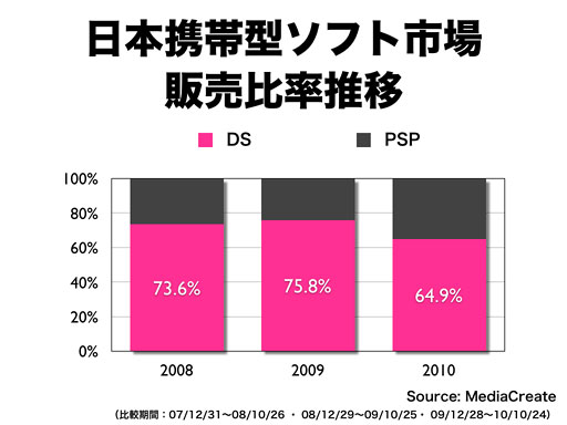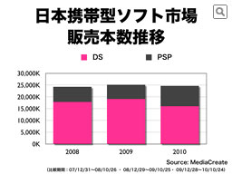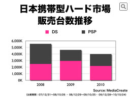 先ほどもお話ししたように、昨年は、この時期までに複数のヒット作が市場を牽引していましたが、今年は『ポケットモンスターブラック・ホワイト』まで、DSに大ヒットソフトがなかったことも影響して、前年実績を割り込んでいます。これに対してPSPは、海外市場と異なり、多くの新作タイトルがリリースされる独自の市場環境となっており、前年実績を上回る推移となっています。
