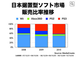 昨年、Wiiの落ち込みが大きくクローズアップされましたが、ここまでのところは、今年は、昨年対比で若干のプラスになっています。PS3も昨年に対して伸びています。この結果、今年は、Wiiの市場シェアが46%、PS3が45%とほぼ拮抗しています。