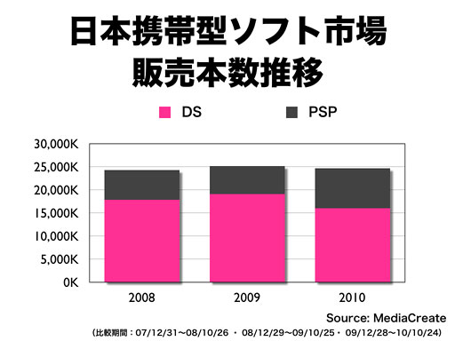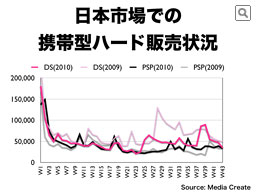 これは、日本市場における2008年から2010年までの1月から直近週までの携帯型ハードの販売台数を比較したものです。