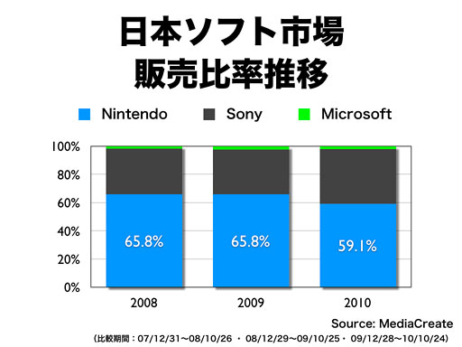 そのような背景もあって、携帯型の中でのDSのソフトシェアは、下がってしまいました。アメリカやヨーロッパでは、ほぼ8割以上のシェアがありますので、日本だけは、携帯型ソフト市場は大きく異なる状況になっています。