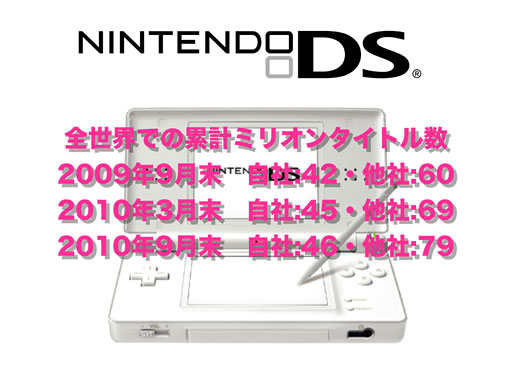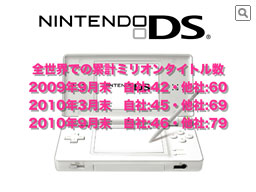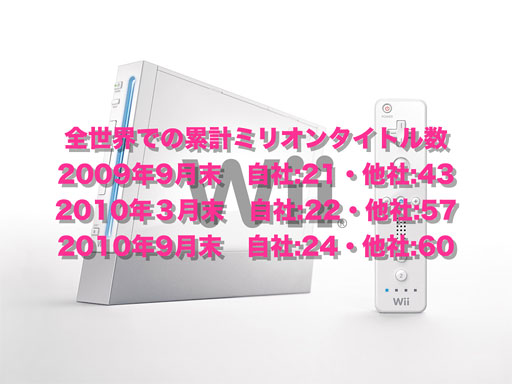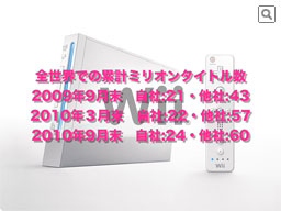 ちょうど1年前の2009年9月末に、DS向けのソフトメーカーさんのミリオンタイトル数が60タイトルでしたから、2年遅れて発売されたWiiは、期間的には1年短い期間で、ソフトメーカーさんのミリオンタイトル数が同じ60タイトルに到達したことになるわけです。