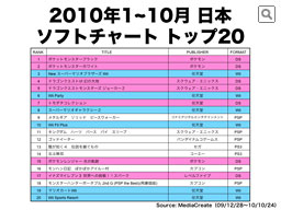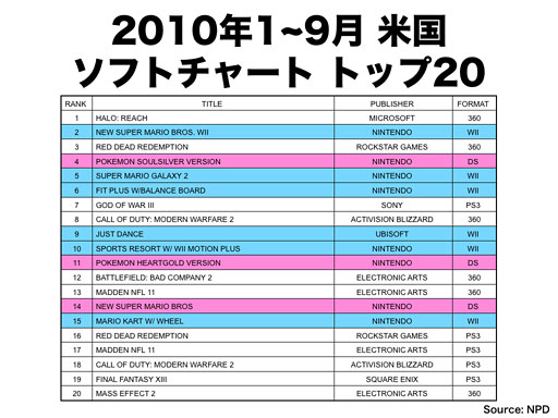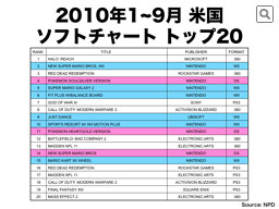 任天堂プラットフォームのタイトルが9タイトル含まれていますが、『ポケモン ハートゴールド・ソウルシルバー』と『スーパーマリオギャラクシー 2』以外は、昨年以前に発売されたタイトルです。特に、DSの『New スーパーマリオブラザーズ』は、2006年に発売されたタイトルです。一方で、他社のプラットフォームでは、『CALL OF DUTY: MODERN WARFARE 2』以外は、今年発売されたタイトルです。初動中心のタイトルが多い任天堂以外のプラットフォームと、定番のロングセラー型のタイトルが多い任天堂は対照的であると言えます。また、アメリカでは、Xbox360のタイトルの存在感が大きいことも特徴で、マルチプラットフォーム展開されているソフトでは、PS3バージョンよりも上位になることが多いことも特徴になっています。