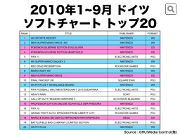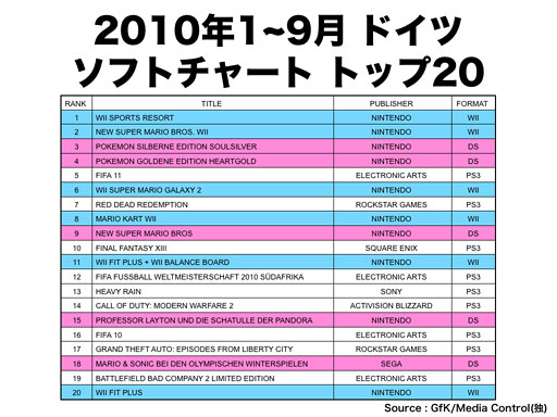 少し細かくなりますが、ヨーロッパの市場を国別にご紹介します。これは、ドイツの今年9月までのソフト販売上位20位までのヒットチャートです。