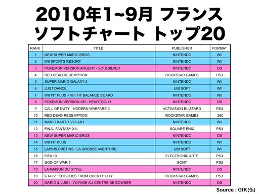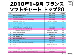 これは、フランスの今年の9月までのソフト販売上位20位までのヒットチャートです。