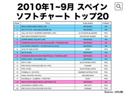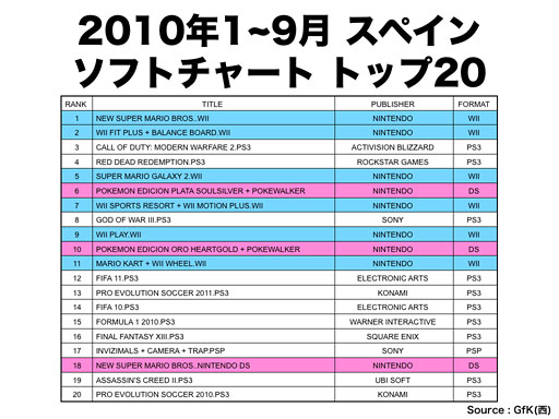 これは、スペインの今年9月までのソフト販売上位20位までのヒットチャートで、任天堂プラットフォームのタイトルは9タイトルあります。スペインは、伝統的にソニーさんが強いマーケットで、Xbox360タイトルがチャートには含まれていません。