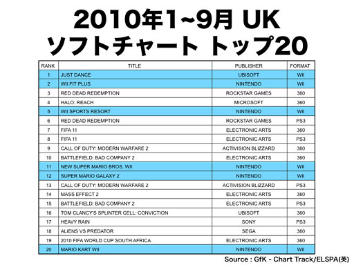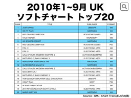 これは、イギリスの今年9月までのソフト販売上位20位までのヒットチャートです。任天堂プラットフォームのタイトルが6タイトルと、今回紹介する市場の中で、もっとも少なくなっています。