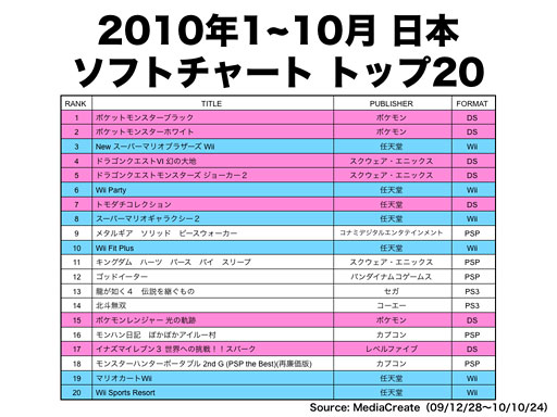 ご覧のように、任天堂プラットフォームのタイトルが11タイトルあり、アメリカ以上にトップ20にDSタイトルが多いのが特徴です。その一方で、アメリカと大きく異なり、20位までにXbox360タイトルはありません。