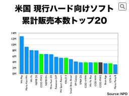 このグラフの水色が任天堂プラットフォームのタイトル、緑色がマイクロソフトさんのプラットフォームのタイトル、グレーがソニーさんのプラットフォームのタイトルです。他社さんのプラットフォームでは、『CALL OF DUTY』4タイトル、『Grand Theft Auto』、『HALO』が並んでいます。これ以外は任天堂のタイトルです。