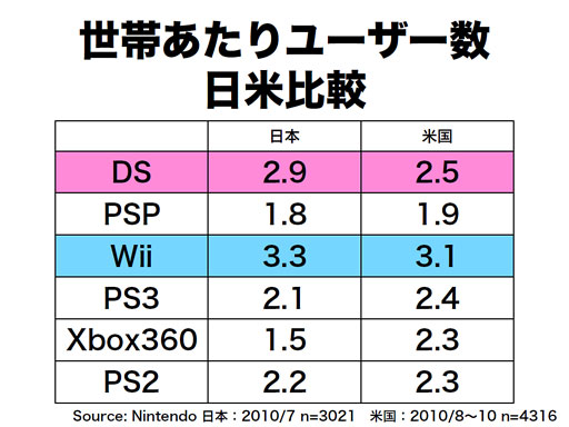 岩田: 一般的なマーケティングの考え方においては、「レイトマジョリティー層」と呼ばれる、実際に商品に興味を持たれても行動はなかなかされない、いわば、売るのが難しいお客様に対しては、より販売の効率が良くなくて、コストがかかるし、時間がかかるし、繰り返し認知を高めて興味を持っていただいて、そして、最後にお店でお買い上げいただく時に背中を押してと、何重にも物事をしなければならないんだということが言われていると思います。一方で、なぜ私どもがこの年末に、「そうはいっても(そういうお客様への販売が)期待できるのではないか」と考えているかといいますと、それは、先ほど申し上げた小売店さんがお得なオファーを出された時への反応が非常に強く出ているという先行指標とともに、もう一つ要因がございまして、実際にこういう人たちが家で物を買う時に、「家族の中での合意形成」というのが非常に重要になると考えているんです。 以前から繰り返し申し上げていることなんですが、世帯あたりユーザー数という指標があります。これは、ゲーム機を持っておられる家庭で、そのゲーム機を触っておられるお客様が、その世帯に平均何人いるか、という数字です。私たちは長年これを調べているのですが、Wiiが出るまでこの数字が3に達したゲーム機はなかったんですね。ずっとこのゲーム機(Wii)の世帯あたりユーザー数は3以上を維持できています。ということは、独り暮らしの方も含めて平均が3だということですから、4人家族の方でも、4人ともお客様であるということが非常に割合として高いということでないと3を超えるような数字にはならないんです。これを他社さんのゲーム機と比べると、はっきり傾向が違うことがお分かりいただけると思うのですが、一言で言うと、家に買って帰った時に家族のみんなが歓迎してくれそうか、歓迎してくださる家族もいるけれども、そうでない家族もいるかもしれないという状態かというのは、こういう購入に慎重なお客様が買われるかどうかという点では非常に重要だと思っているんですね。 ですから、私たちで言えば、今までの定番による積み上げにプラスして、今年年末に出る新作、例えばそれは年末に出る『ドンキーコング』だったりしますが、そういうものがあり、そしてさらに、小売店さんと組んだキャンペーンや、25周年のキャンペーン、それに向けての限定のハードなど、いろいろなものの積み上げで、そのハードルを越えていこうということで、それを全部積み上げていけばハードルを越える人は去年と同じとまではいかなくても、去年にかなり近い水準までいけるのではないかなというふうに考えています。未来のことなので、数字の保証はしようがないのですが、私たちが今マーケットをどのように見ているのかという意味では以上のようなご説明でよいかと思います。 |