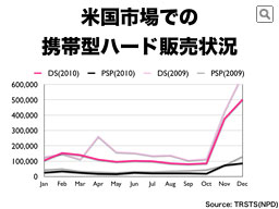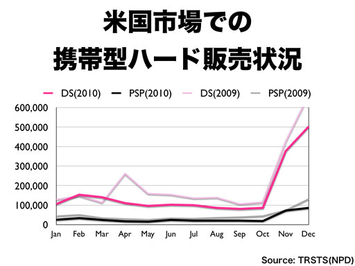 年末商戦において、DSは販売を伸ばしました。ニンテンドー3DSの発売を控えた昨年12月の販売数250万台は、決して悪い結果ではないと思いますが、2009年12月の実績は330万台という非常に大きな数字でしたから、その実績には届きませんでした。
