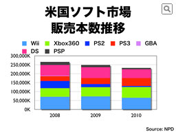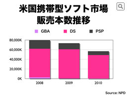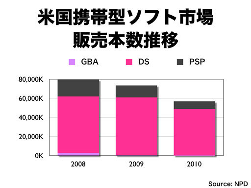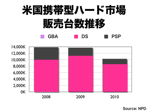 これは、2008年から2010年にかけての、アメリカ市場における携帯型ハードの年間販売台数の推移です。