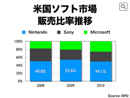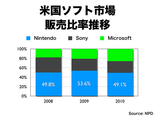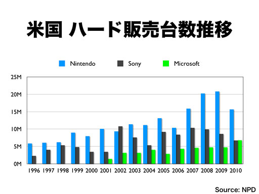 前回は、2007年、2008年、2009年の3年間の任天堂ハードの販売台数は、業界の歴史上例のないレベルに到達していたとお話ししましたが、2010年も、任天堂の販売台数、すなわちWiiとDSの合計台数が1500万台を上回り、2007年とほぼ同水準となり、他の2社さんの2.3倍以上の実績です。また、今回初めて、マイクロソフトさんがハード販売台数でソニーさんをごくわずかな差で抜きました。