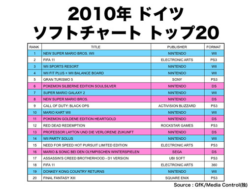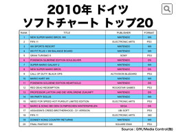 まず先に、少し細かくなりますが、ヨーロッパの市場のヒットチャートを国別にご紹介します。これは、2010年のドイツの年間ソフト販売上位20位までのヒットチャートです。