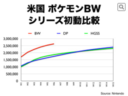 まず、アメリカにおける販売推移です。ご覧の赤い線が今回の『ポケモンブラック・ホワイト』の販売推移です。青い線は『ポケモンダイヤモンド・パール』の販売推移、緑色の線は『ポケモンハートゴールド・ソウルシルバー』の販売推移です。