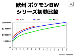 続いて、ヨーロッパにおける販売推移です。ヨーロッパにおいても、『ポケモンブラック・ホワイト』の販売推移は、『ポケモンダイヤモンド・パール』、『ポケモンハートゴールド・ソウルシルバー』を上回るペースになっています。