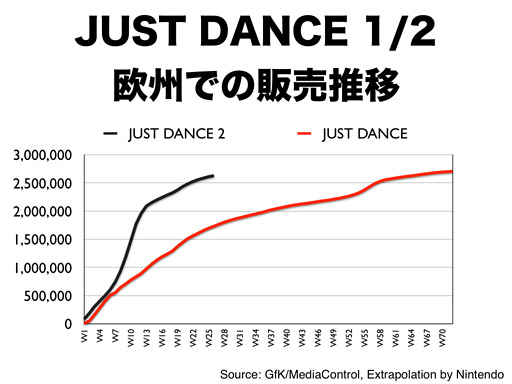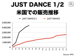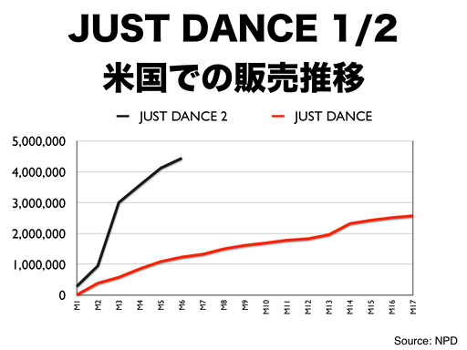 これは、アメリカのNPDのデータから毎月の販売数を抜き出して集計したものです。『JUST DANCE 2』のアメリカでの販売数は、既に450万本を超えていて、かつ、アメリカでは、年が明けてから最も販売数の多いソフトとなっていますし、今の勢いなら、まだまだ数を伸ばすポテンシャルがあると思います。Wiiのソフト市場でこういう売れ方をするソフトは、これまで任天堂のソフトがほとんどだったわけですが、ソフトメーカーさんの大きな成功例として、メガヒットソフトに育ったと思います。