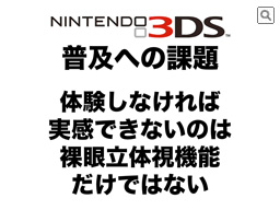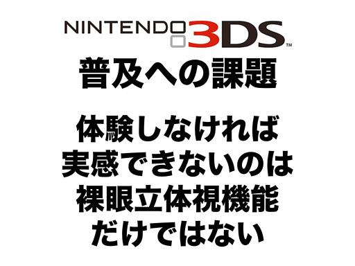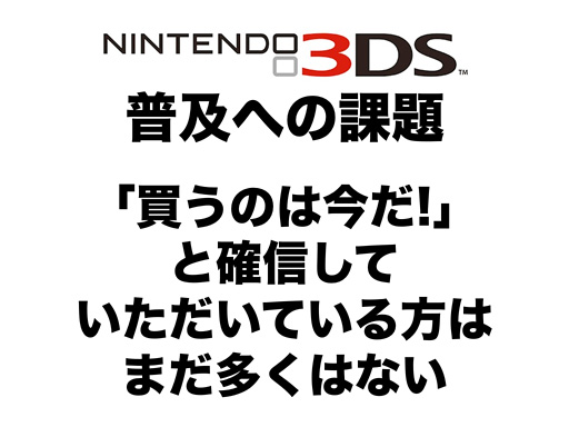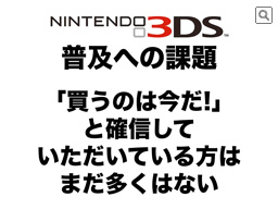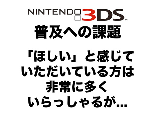 そして、最後の課題です。ニンテンドー3DSを「ほしい」、「買いたい」と感じてくださっている方は非常に多くて、過去の当社の新しいプラットフォームの発売時の中でも最大級の潜在需要があるということは、 私たちの市場調査でわかっているわけですが、その一方で、